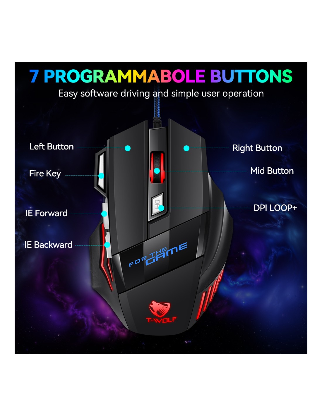 5. 7 botones diseñados para juegos: el ratón tiene 7 botones, incluidas las teclas de corte rápido de avance/retroceso y disparo, que están optimizadas para juegos.